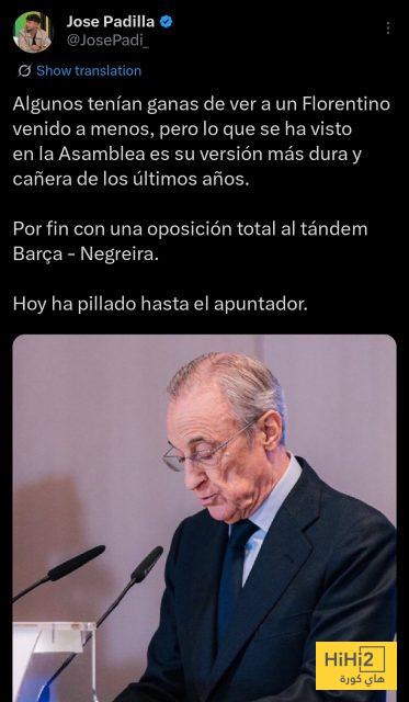” كان البعض يأمل في رؤية فلورنتينو ضعيفًا ، لكن ما رأيناه في الجمعية كان أشدّ وأكثر نسخه عدوانية في السنوات الأخيرة .. وأخيرًا، معارضة شاملة لشراكة برشلونة ونيغريرا .. حتى أنه فاجأ الجميع اليوم “.