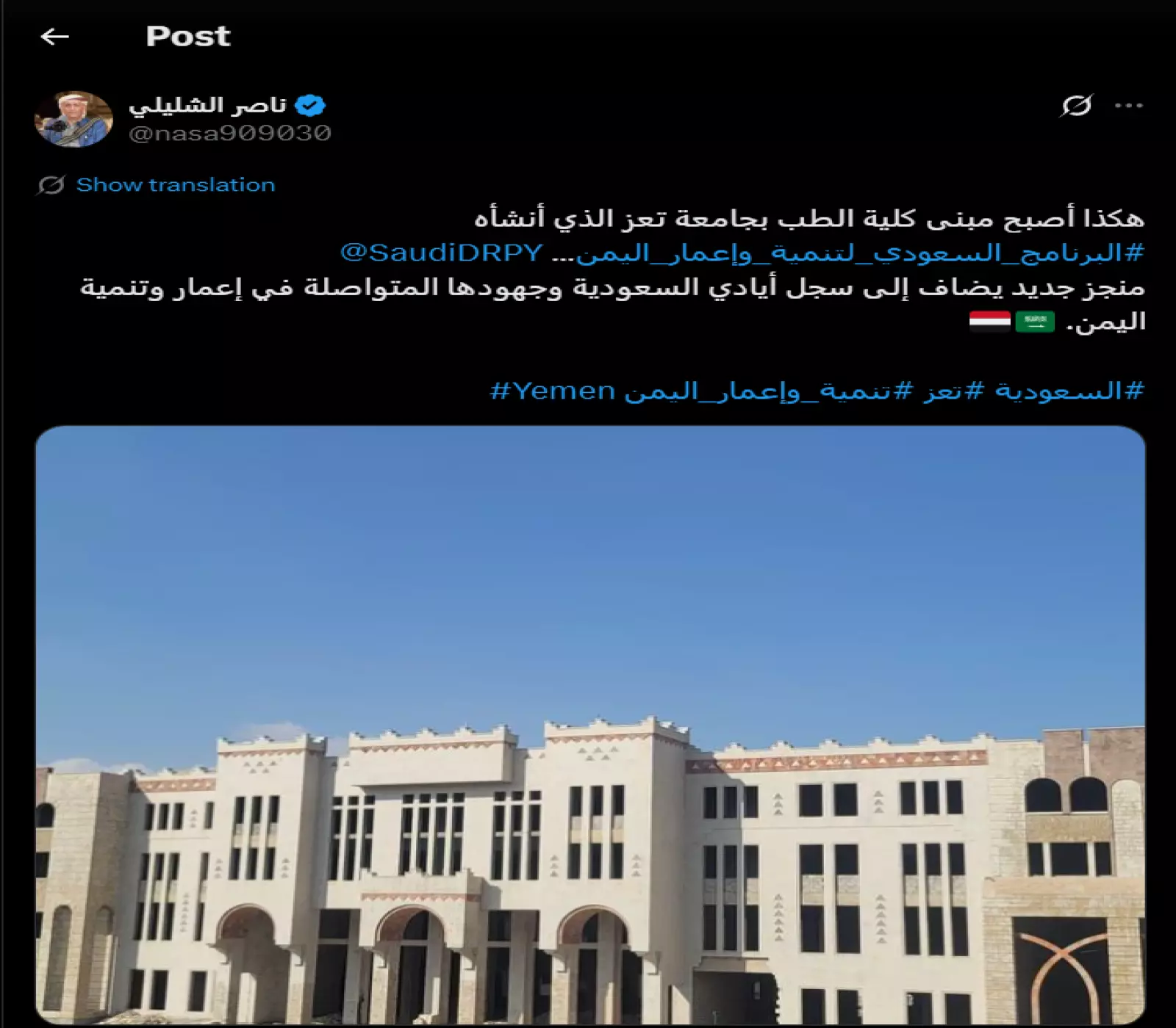 تجسد هذه الهدية في مبنى كلية الطب بجامعة تعز، الذي تم تشييده بدعم كامل من البرنامج السعودي لتنمية وإعمار اليمن، ليكون صرحًا علميًا حديثًا يليق بمستقبل التعليم الطبي في المحافظة.